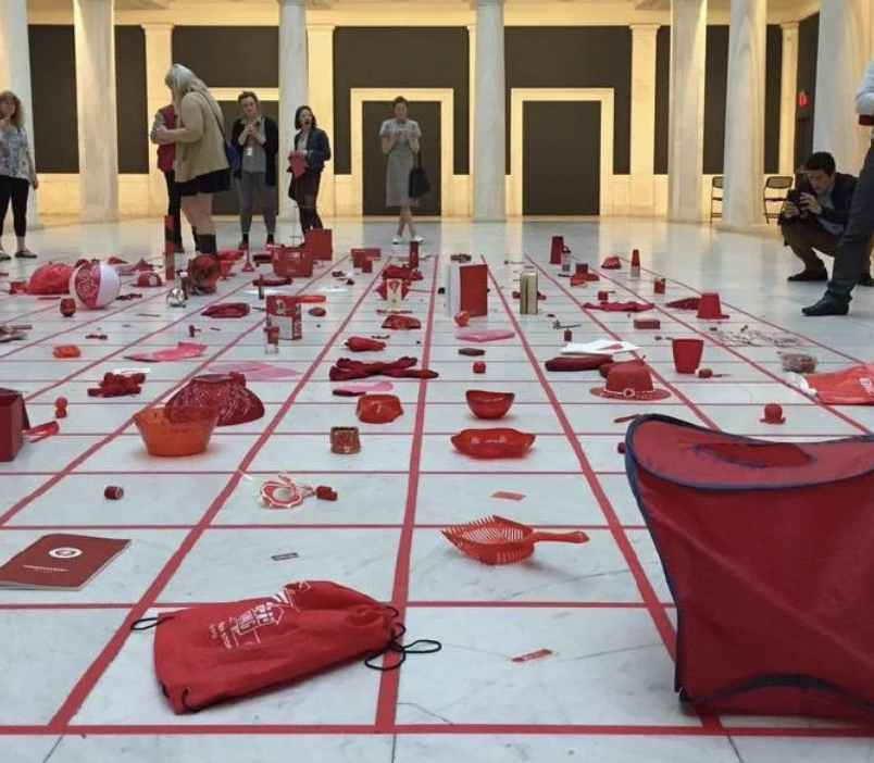 *Visitors are encouraged to engage with the art by bringing a red, hand-held object from their own environment to place in the grid.
